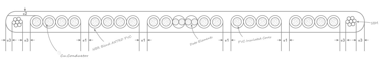 0.75 mm2; Composite - Annealed bare Cu Cond., Special elastomeric blend PVC Insulated & Sheathed Composite Flat Travelling Cable with shielded data elements; 300/500 V